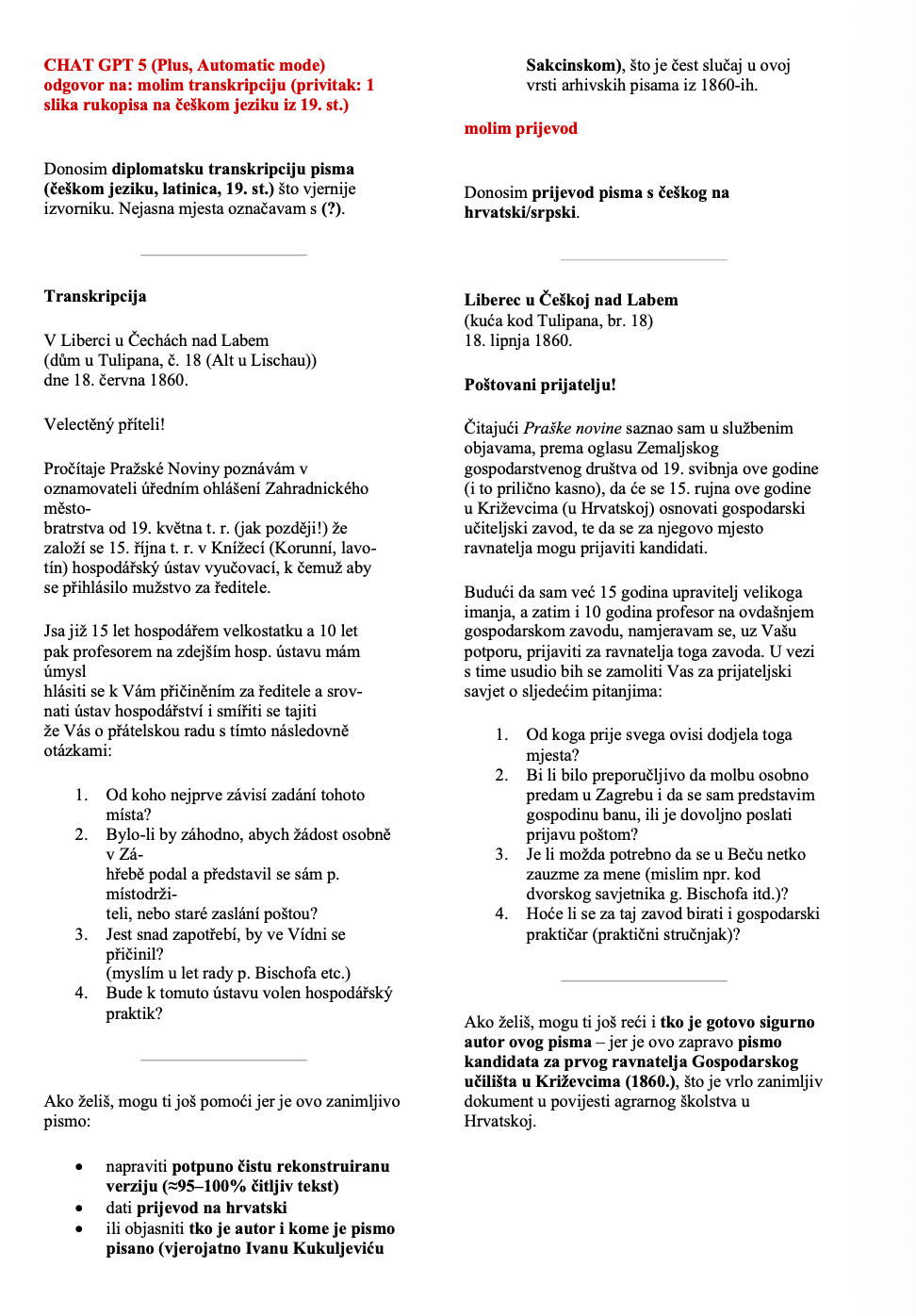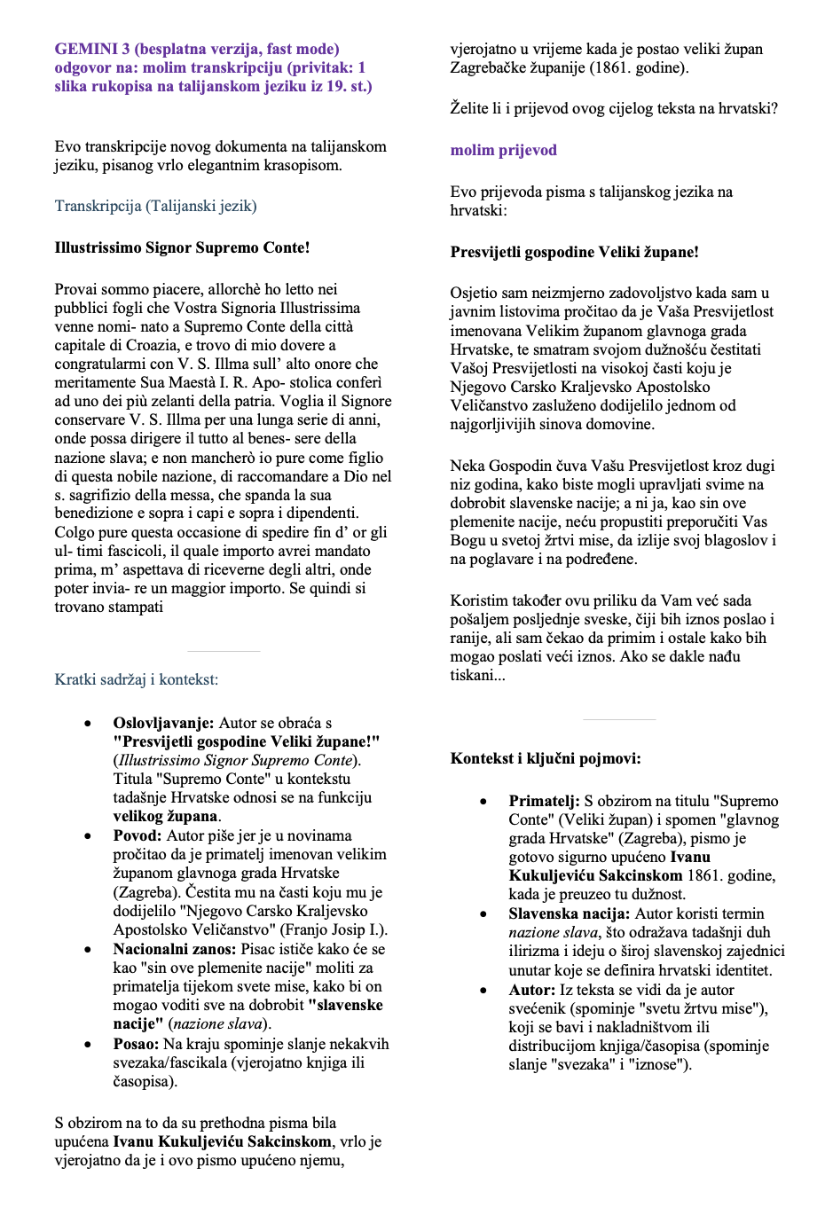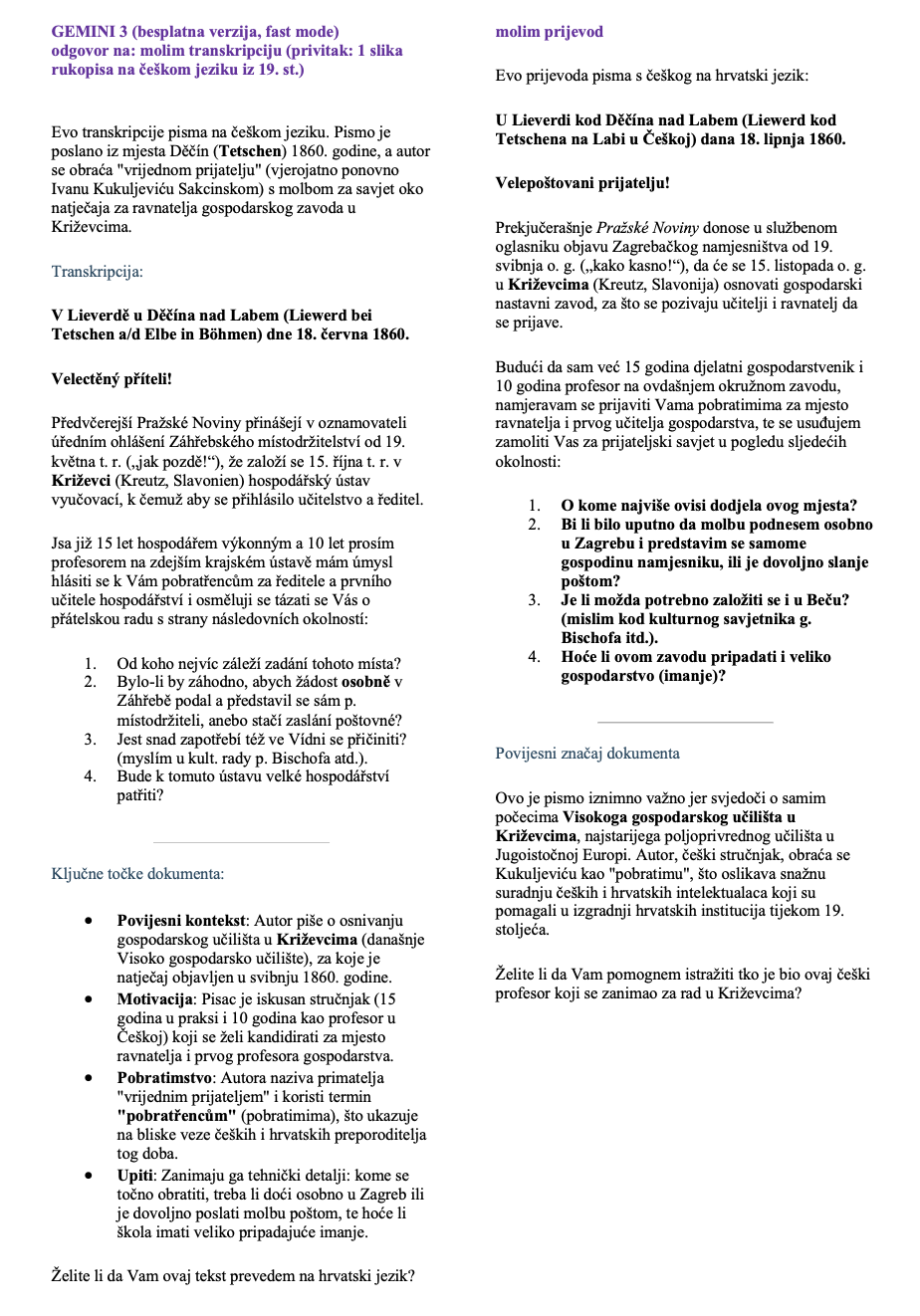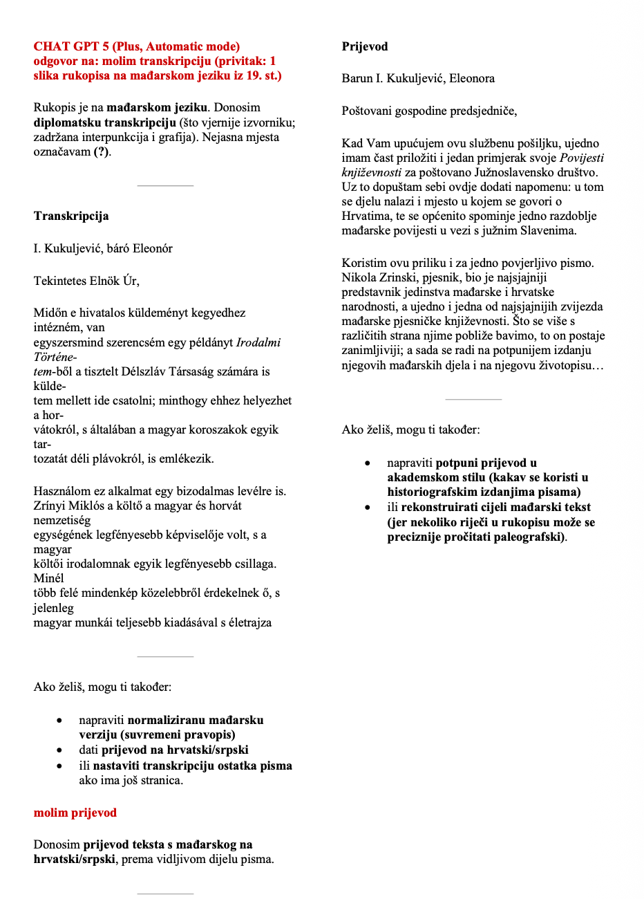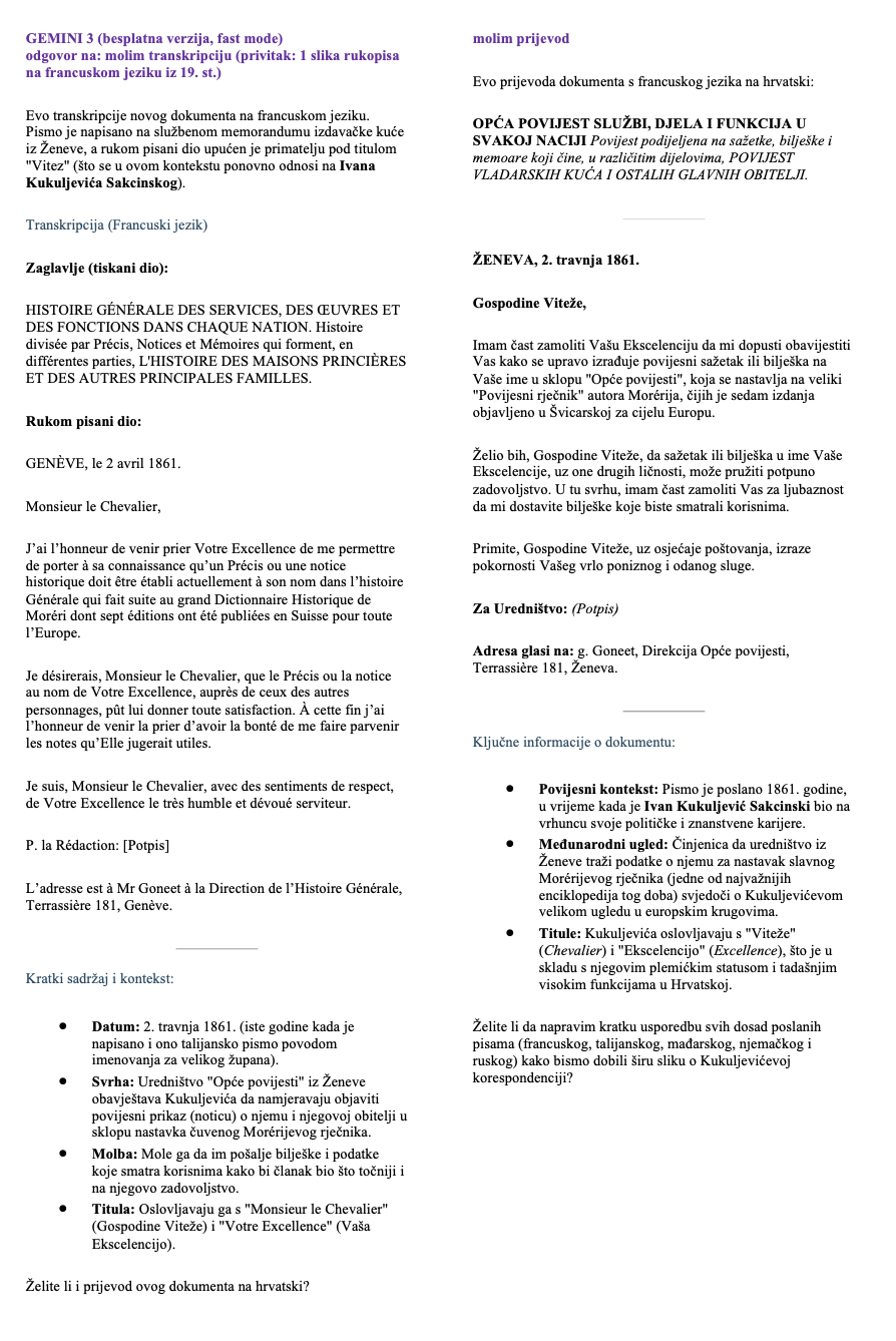 Mogu li opći AI modeli koje nude Gemini i ChatGPT vjerodostojno transkribirati i transliterirati rukopisne izvore? Testirali smo ih na korespondenciji Ivana Kukuljevića Sakcinskog. Za potrebe kratkog testiranja iskorišteno je 7 pisama, pisanih na sedam jezika (hrvatski, njemački, mađarski, talijanski, francuski, latinski, češki).