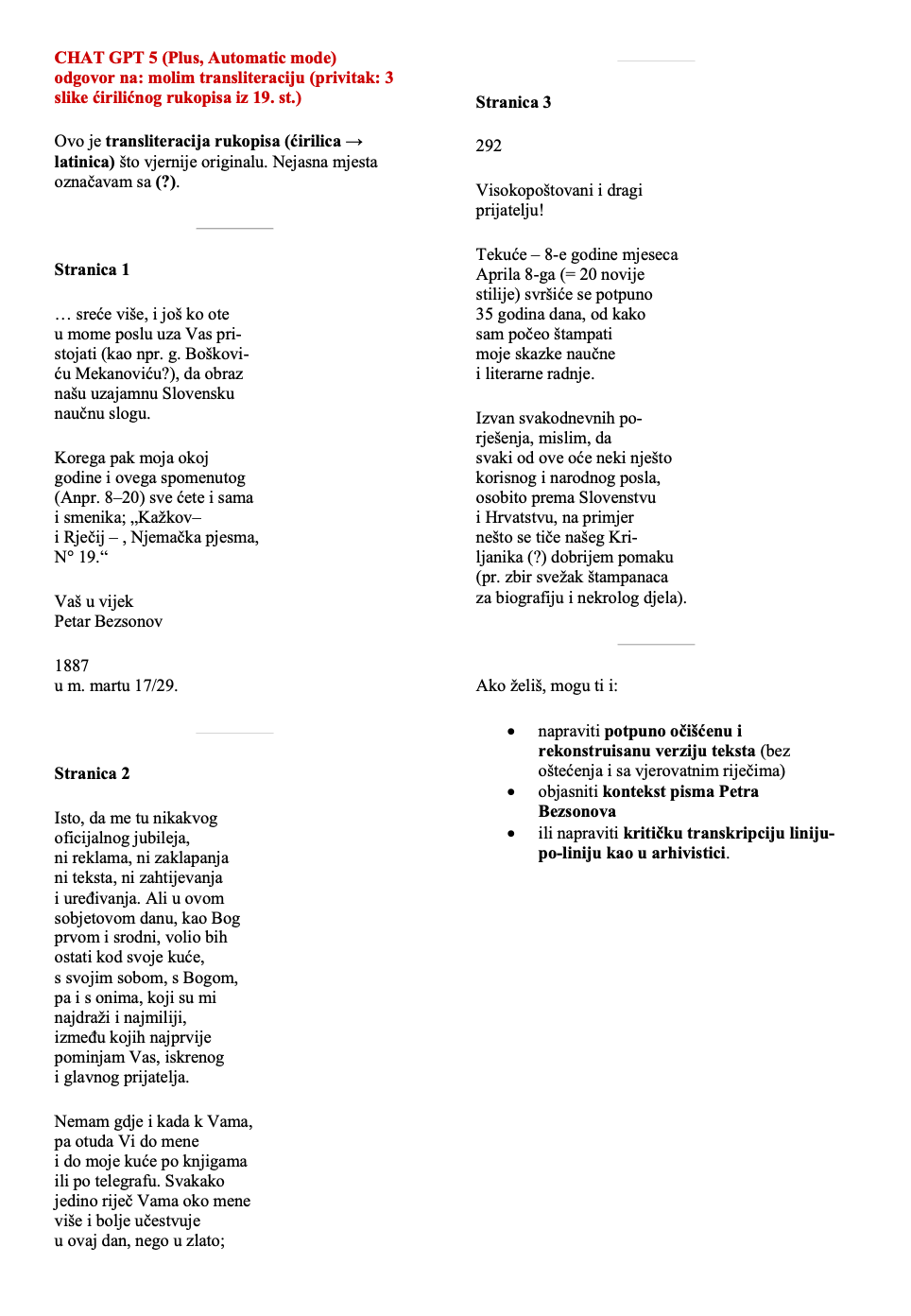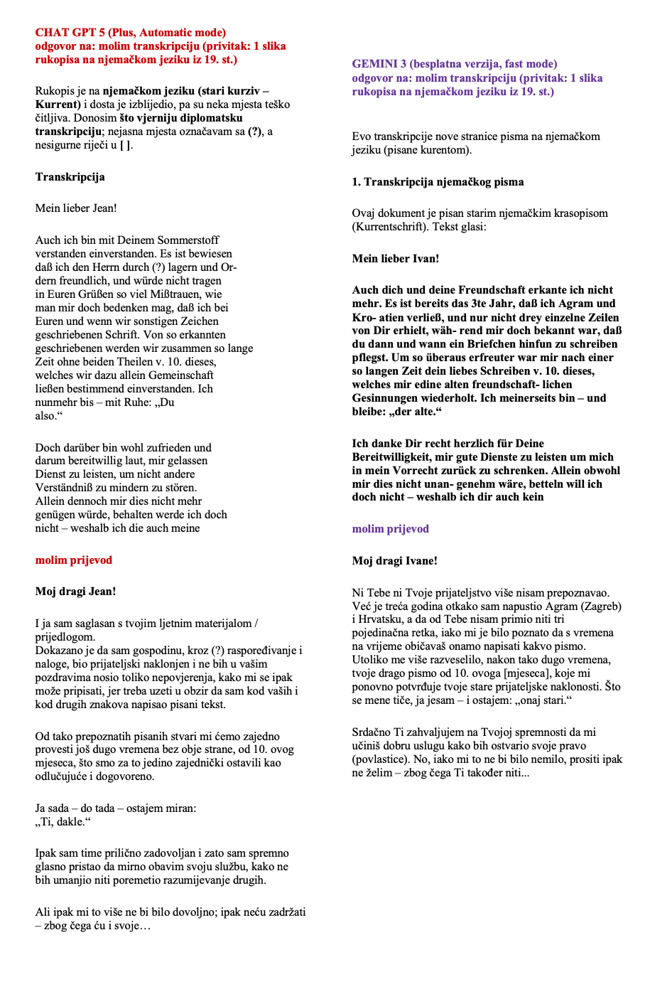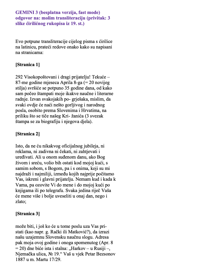 Međutim, ako ne tražimo dlaku u jajetu, AI je izvrstan alat za ubrzavanje transkripcije – što ova analiza i pokazuje. To je posebno vidljivo kod lakših rukopisa (npr. u ovoj analizi francusko i talijansko pismo), ali potreban je oprez kod kompleksnijih povijesnih izvora.