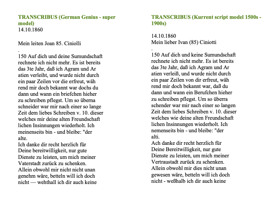 Analiza je pokazala da je Transkribus bez preciziranja odnosno korištenja točno specifičnih modela gotovo neupotrebljiv. Drugim riječima, Transkribus ne nudi brzo prepoznavanje teksta koje nude opći AI modeli kao što su ChatGPT i Gemini. Za relativnu preciznost potrebno je ili trenirati vlastiti model ili iskoristiti specifičan model za sličan korpus izvora. Dok su neki autorski modeli trenirani na manjem korpusu izvora, veliki modeli poput German Genius trenirani su na znatno većem korpusu.Stoga su u ovoj analizi za transkripciju pisma na njemačkom iskorišteni i: